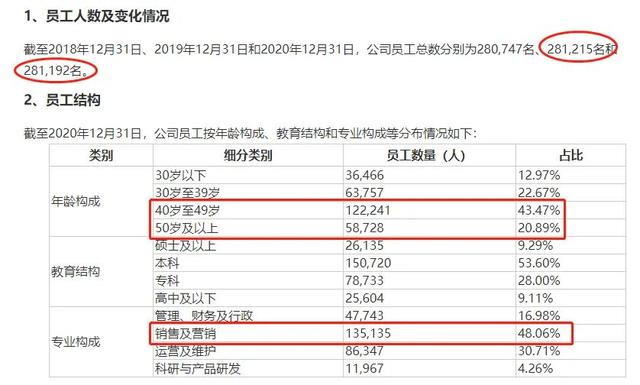 中国电信这几年员工数基本稳定在28万出头,从人员构成来看,销售和营销人员占比48%,运营及维护占31%。40岁及以上员工占比超64%。