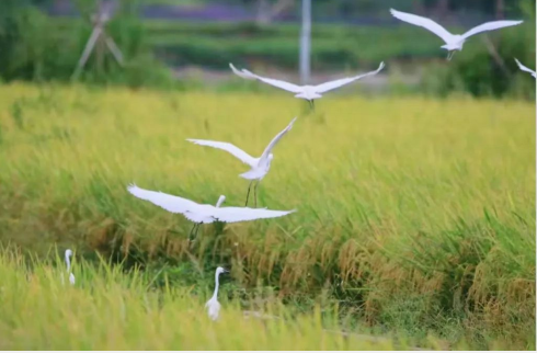 蓝天白云下,一幅繁忙美好的丰收画卷让人欣喜,欢乐的人们在田里抚摸稻谷,体验丰收的喜悦。一旁刚收割完的稻田,引来各种鸟类前来觅食栖息,其中不乏白鹭等国家二级重点保护动物,在田间时而展翅飞翔,时而休闲踱步,见证了中堂生态环境不断优化的乡村振兴美丽图景。