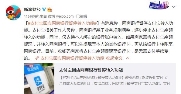 随后,网商银行对媒体表示,支付宝并未关闭免费提现渠道,网商银行只是逐步停止支付宝余额转入的功能,但仍然支持本人绑定的银行账户转入。