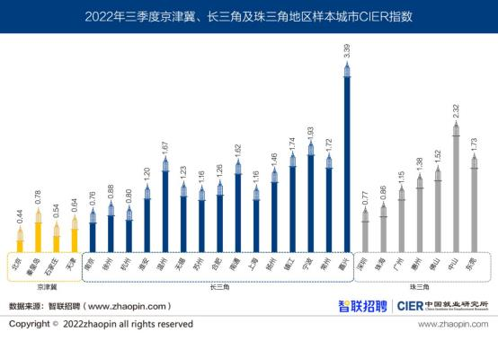 从整体来看,本季度东北地区CIER指数环比上升、同比下降;京津冀地区CIER指数为0.6,区域内城市CIER指数均小于1,就业市场仍相对紧张;北京的CIER指数为0.44,环比上升,同比下降;而珠三角地区CIER指数为1.39,环比上升。环比来看,招聘需求人数下降2.78%,求职申请人数下降35.1%,相比其他地区,需求下降速度更慢,而供给下降速度更快。同比方面,珠三角地区人才供需增长明显。其中,招聘需求人数增长48.55%,求职申请人数增幅高达113.99%,增幅也高于其他地区。受供给增幅大于需求的影响,CIER指数高于上季度的0.88,低于去年三季度的1.82。