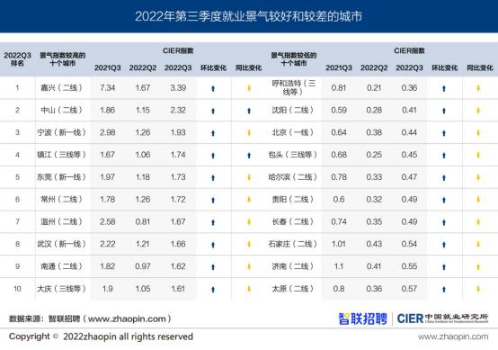 值得一提的是,2022年三季度CIER指数较高的城市仍主要是长三角、珠三角地区的二三线城市,如嘉兴、中山、镇江、常州等。新一线城市中的宁波、东莞和武汉CIER指数也相对较高。与上一季度相比,所有城市的求职申请人数下降,半数景气指数较高城市的招聘需求人数上升,就业景气指数均上升。