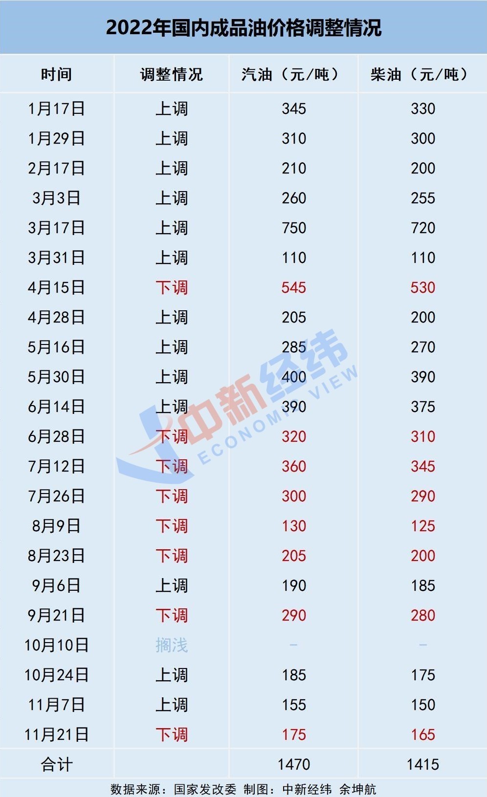 据中新经纬梳理,今年以来,国内成品油价格已经进行了22轮调整,呈现“13涨8跌1搁浅”格局,汽油价格累计上调1470元/吨,柴油价格累计上调1415元/吨。若本轮下调落实,则国内成品油调价将迎来年内第9次下调。