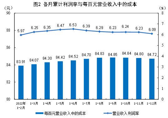 2022年,规模以上工业企业每百元营业收入中的成本为84.72元,比上年增加0.91元;每百元营业收入中的费用为8.20元,比上年减少0.42元。