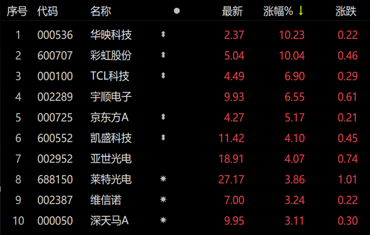 近日,面板板块开盘走强。截至15日午间,华映科技、彩虹股份涨停封板;TCL科技、宇顺电子、京东方A涨超5%;莱特光电、维信诺、深天马A等跟涨。