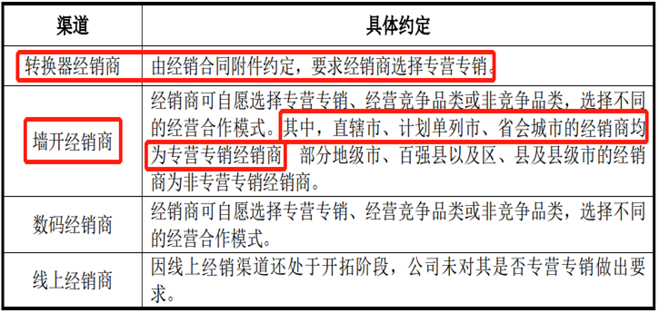 而根据公牛对经销商的管理约定,转化器经销商要求全部选择专营专销,墙开(墙壁开关)经销商则要求直辖市,计划单列市、省会城市的经销商为专营专销,数码经销商可自愿选择专营专销。