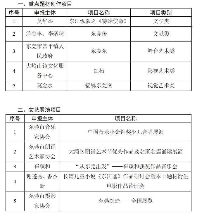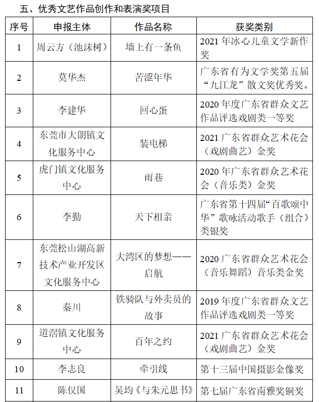 为进一步繁荣文艺创作,根据《东莞市文化发展专项资金管理暂行办法》(东府办〔2022〕28号),市委宣传部近期开展了2022年东莞市文化发展专项资金(文化艺术类)评审工作。根据评审结果,拟对31个项目进行资助(奖励)。其中,重点题材创作项目5个,文艺展演项目5个,重点文艺品牌项目1个,配套项目5个,优秀文艺作品创作和表演奖项目15个。