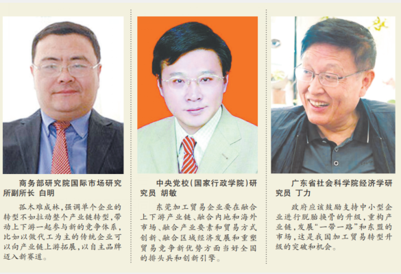 本期东莞日报邀请到商务部研究院国际市场研究所副所长白明、中央党校(国家行政学院)研究员胡敏、广东省社会科学院经济学研究员丁力,共同讨论当代加工贸易在我国经济发展中的意义以及转型升级路径。