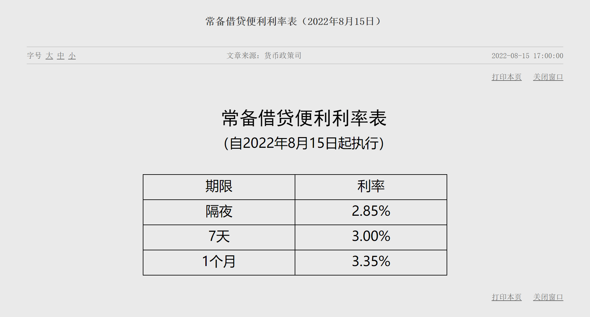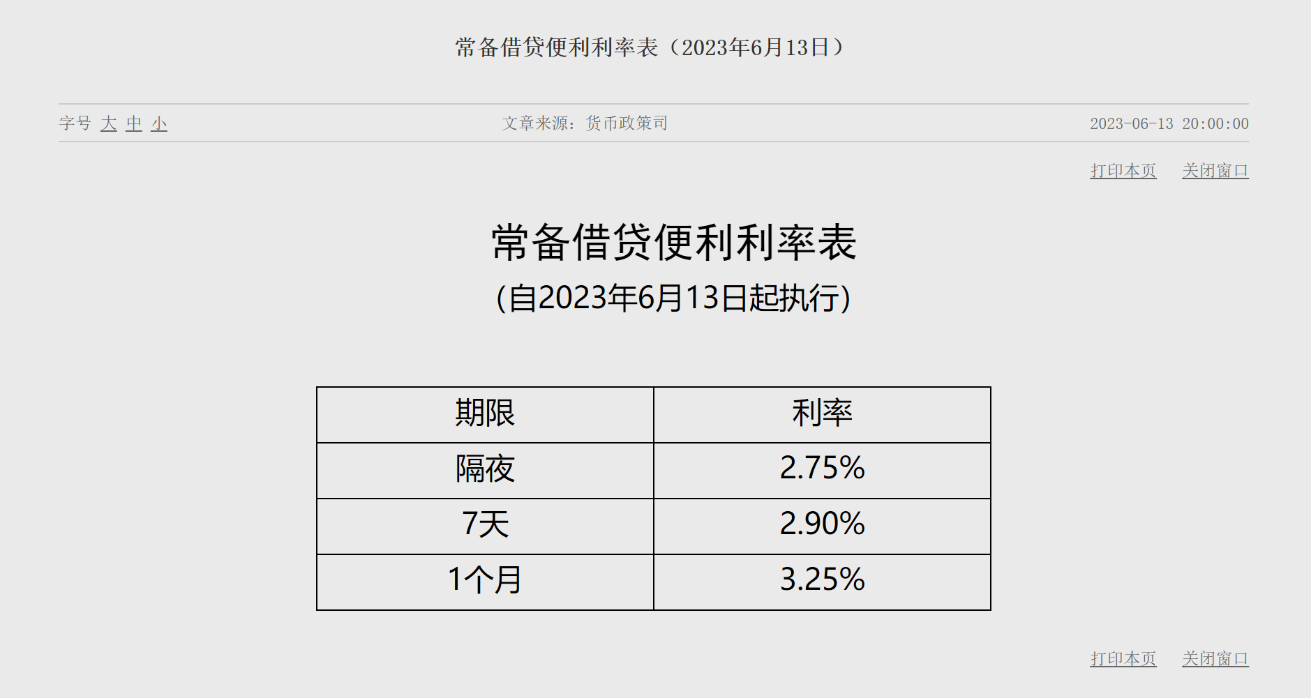 央广网北京6月13日消息(记者 冯方)6月13日晚间,人民银行更新常备借贷便利利率表,将各期限常备借贷便利(SLF)利率均下调10个基点,自2023年6月13日起执行。具体来看,隔夜期下调至2.75%,7天期下调至2.90%,1个月期下调至3.25%。