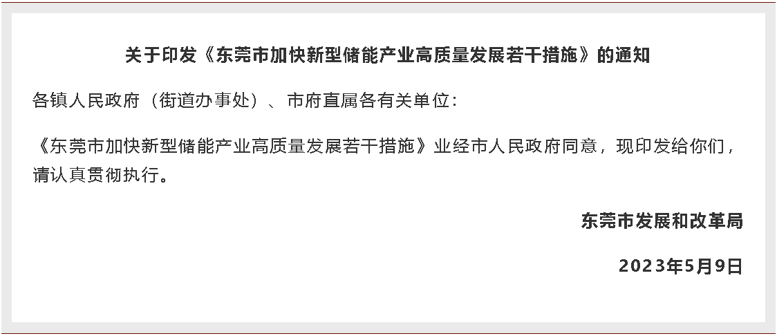 为贯彻落实《广东省推动新型储能产业高质量发展指导意见》《东莞市新能源产业发展行动计划(2022—2025年)》工作要求,进一步加快培育发展新动能,推动新型储能产业高质量发展,结合我市实际,制定以下政策措施。
