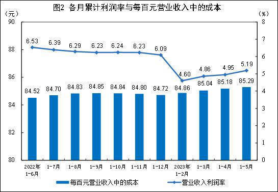 1—5月份,规模以上工业企业每百元营业收入中的成本为85.29元,同比增加0.93元;每百元营业收入中的费用为8.31元,同比增加0.30元。