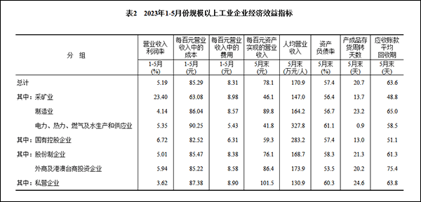 5月末,规模以上工业企业每百元资产实现的营业收入为78.1元,同比减少5.8元;人均营业收入为170.9万元,同比增加5.8万元;产成品存货周转天数为20.7天,同比增加1.0天;应收账款平均回收期为63.6天,同比增加6.4天。