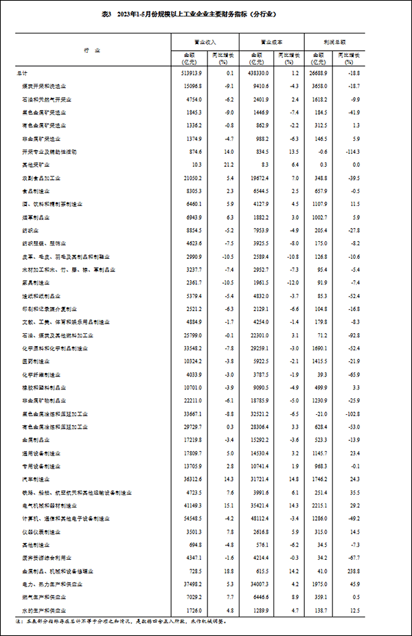 1—5月份,在41个工业大类行业中,14个行业利润总额同比增长,1个行业持平,24个行业下降,2个行业由盈转亏。主要行业利润情况如下:电力、热力生产和供应业利润总额同比增长45.9%,电气机械和器材制造业增长29.2%,汽车制造业增长24.3%,通用设备制造业增长23.4%,专用设备制造业下降0.1%,石油和天然气开采业下降9.9%,煤炭开采和洗选业下降18.7%,非金属矿物制品业下降25.9%,纺织业下降27.8%,农副食品加工业下降39.5%,计算机、通信和其他电子设备制造业下降49.2%,化学原料和化学制品制造业下降52.4%,有色金属冶炼和压延加工业下降53.0%,石油、煤炭及其他燃料加工业下降92.8%,黑色金属冶炼和压延加工业由盈利转为亏损。