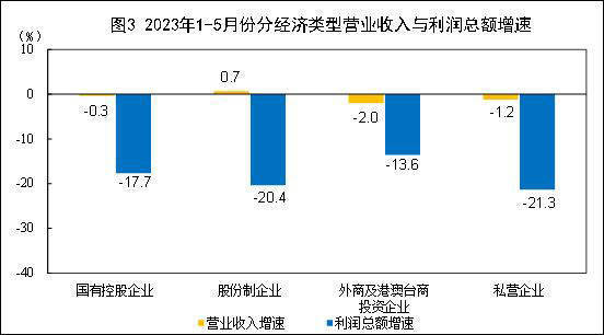 1—5月份,规模以上工业企业中,国有控股企业实现利润总额9625.1亿元,同比下降17.7%;股份制企业实现利润总额19578.1亿元,下降20.4%;外商及港澳台商投资企业实现利润总额6267.5亿元,下降13.6%;私营企业实现利润总额6837.8亿元,下降21.3%。