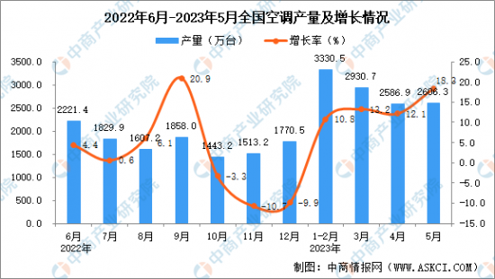 2022-2027年中国空调行业供需格局分析及投资风险预测报告中商情报网讯:据中商产业研究院数据库显示,2023年5月全国空调当月产量与去年同期相比增长。2023年5月全国空调产量为2606.3万台,同比增长18.3%。2023年1-5月全国空调产量为11425万台,同比增长14.2%。