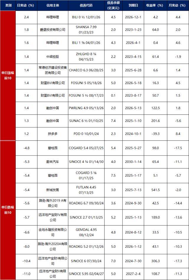 7月5日,14只地产债成交价格偏离幅度超10%。其中,“21远洋01”跌超14%,“21远洋02”“15远洋03”跌超17%,“21旭辉02”跌超20%,“15远洋05”跌超21%,“19远洋01”跌超31%,“22远洋控股PPN001”跌超32%,“20宝龙04”跌超33%,“19远洋02”跌超35%,“21远洋控股PPN001”跌超36%,“18远洋01”跌超41%;“22金地MTN001”涨超13%,“20阳城01”“20阳城03”涨超63%。