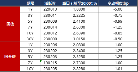 7月5日,债市重回暖势,银行间主要利率债收益率普遍下行。截至北京时间20:00,10年期国债活跃券230012收益率下行0.85bp至2.6300%;10年期国开债活跃券230205收益率下行1.01bp至2.8280%。