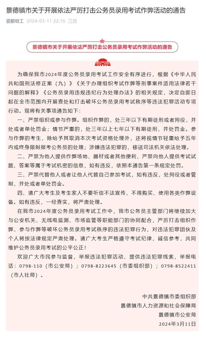 央广网记者梳理发现,3月11日,景德镇市委组织部在微信公众号“瓷都组工”发布了《景德镇市关于开展依法严厉打击公务员录用考试作弊活动的通告》(以下简称《通告》)。《通告》称,“即日起在全市范围内开展查处和打击破坏公务员录用考试秩序等违法犯罪活动专项行动”;
