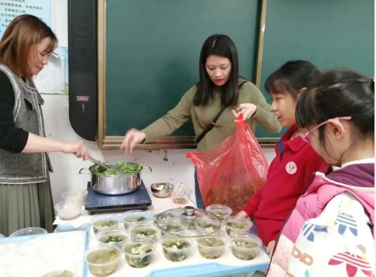春天正是养肝的好时节,枸杞叶具有清肝明目的功效。采摘完,学生们纷纷化身“美食家”,大展身手,把枸杞叶清洗干净,与猪肝、瘦肉、鸡蛋一起制作成营养丰富的枸杞汤,香气四溢,吸引了一群群“小馋虫们”前来品尝。放学时,学生们还把班级最特别的奖——“枸杞”奖带回家,跟家人再次体验“药食同源”的乐趣。