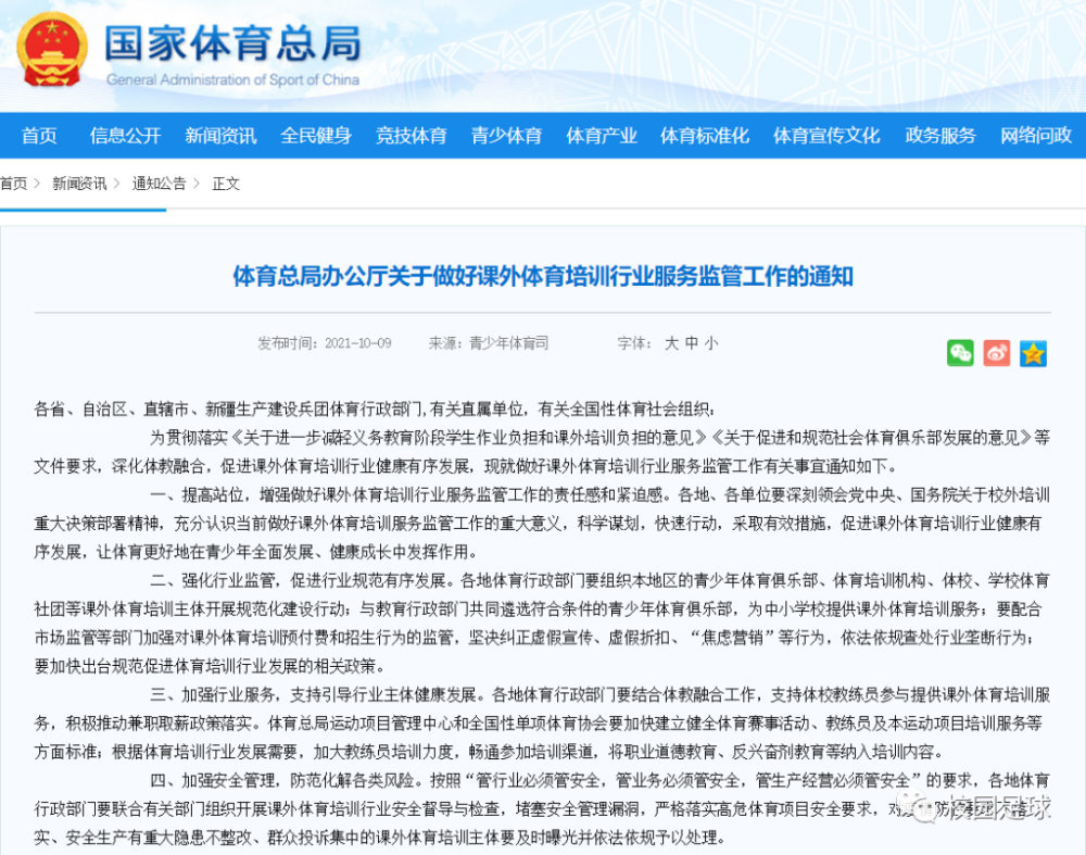 9月28日,国家体育总总局办公厅发布《关于做好课外体育培训行业服务监管工作的通知》,《通知》明确提出,强化行业监管,促进行业规范有序发展。各地体育行政部门要组织本地区的青少年体育俱乐部、体育培训机构、体校、学校体育社团等课外体育培训主体开展规范化建设行动;与教育行政部门共同遴选符合条件的青少年体育俱乐部,为中小学校提供课外体育培训服务;各地体育行政部门要结合体教融合工作,支持体校教练员参与提供课外体育培训服务,积极推动兼职取薪政策落实。