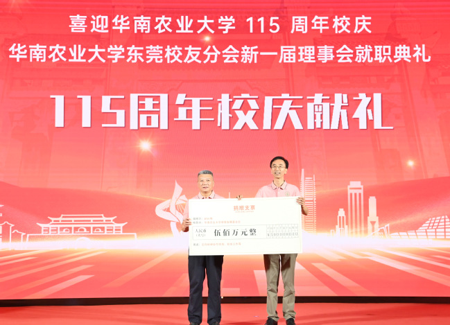 活动当天,大会宣读了华农东莞校友会第四届理事任职批复,向76名新任理事颁发聘书。华南农业大学党委书记李凤亮向华农东莞校友会第四届会长、1993届园林专业校友赵长伟授会旗。值得一提的是,为庆祝华南农业大学115周年校庆,助力学校“双一流”建设,在活动现场,华农东莞校友会捐赠60万元,赵长伟捐赠500万元,用于学校科研项目合作和校友工作。