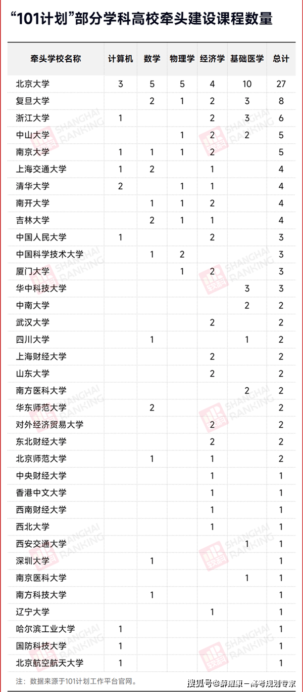 目前“101计划工作平台”官网已公布了9个学科的参与高校、5个学科核心建设课程及牵头高校。其中,计算机学科共12门核心建设课程、数学和物理均有14门核心建设课程、经济10门、基础医学13门。