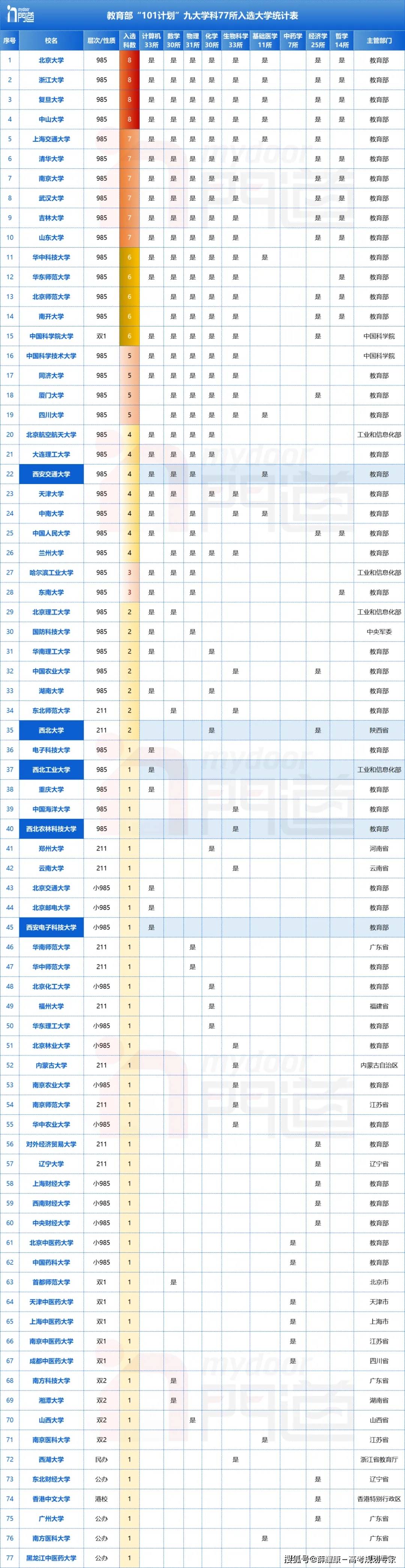 据“101计划工作平台”官网公布的信息显示,截至目前公布的9个学科,共有77所高校入选。计算机有33所高校、数学共30所高校、物理学有31所高校、经济学有25所高校、基础医学有11所高校、化学有30所高校、生物科学33所高校、中药学有7所高校、哲学有14所高校。其中,北京大学、复旦大学、浙江大学、中山大学入选除中药学外的8个学科组,成为入选学科最多的高校。吉林大学、南京大学、清华大学、山东大学、上海交通大学和武汉大学,均入选7个学科工作组。