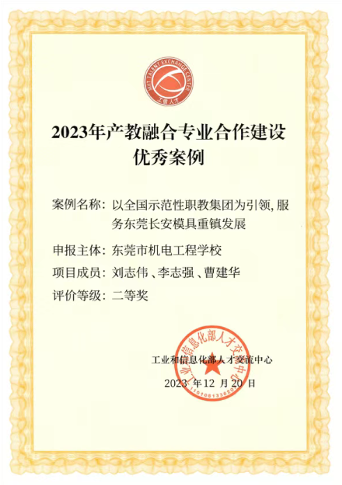 按照工业和信息化部人才交流中心《关于开展2023年产教融合专业合作建设优秀案例征集活动通知》,参与此次优秀案例征集活动的有来自全国的高校、企业以及中职学校等,竞争激烈,经形式审查和专家评审等环节,最终确定了此次优秀案例入围名单,其中优秀案例一等奖10项、优秀案例二等奖20项、优秀案例三等奖30项,共60个项目入围。东莞市机电工程学校获奖的案例是《以全国示范性职教集团为引领,服务东莞长安模具重镇发展》,由该校刘志伟、李志强、曹建华等三位老师完成。
