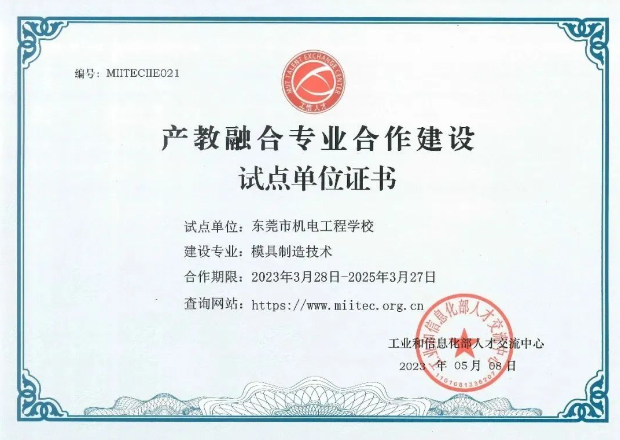 2022年9月,工业和信息化部人才交流中心发布了《关于开展产教融合专业合作建设试点工作的通知》,遴选了第一批产教融合专业合作建设试点单位名单,东莞市机电工程学校模具制造技术专业入选试点名单。