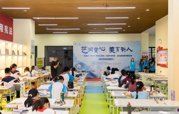 此次现场书画大赛以“艺润童心 美育新人”为主题,分别设置了幼儿组、小学组、中学组、少年宫组等四个组别,并于6月5日在桥头青少年活动中心进行现场比拼。来自全镇各中小学、幼儿园及青少年活动中心的参赛者们现场泼墨挥毫,充分发挥自己的创造力和想象力,通过运用五颜六色的画笔和绘画技巧,将心中美好的事物,勾勒在画纸上,创作出一幅幅主题鲜明、风格多样的精美书画作品。