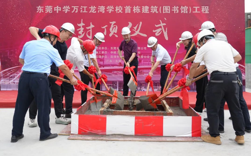 百年大计,教育为本。在万江街道党工委、办事处的正确领导下以及东莞中学的鼎力支持下,东莞中学万江龙湾学校(以下简称“龙湾学校”)工程建设有序进行。6月18日下午,龙湾学校在建设项目现场举行新建学校首栋单体建筑(图书馆)封顶仪式。