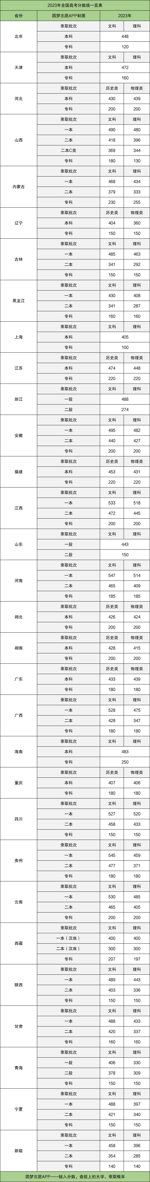 二、2023年全国高考录取分数线一览表