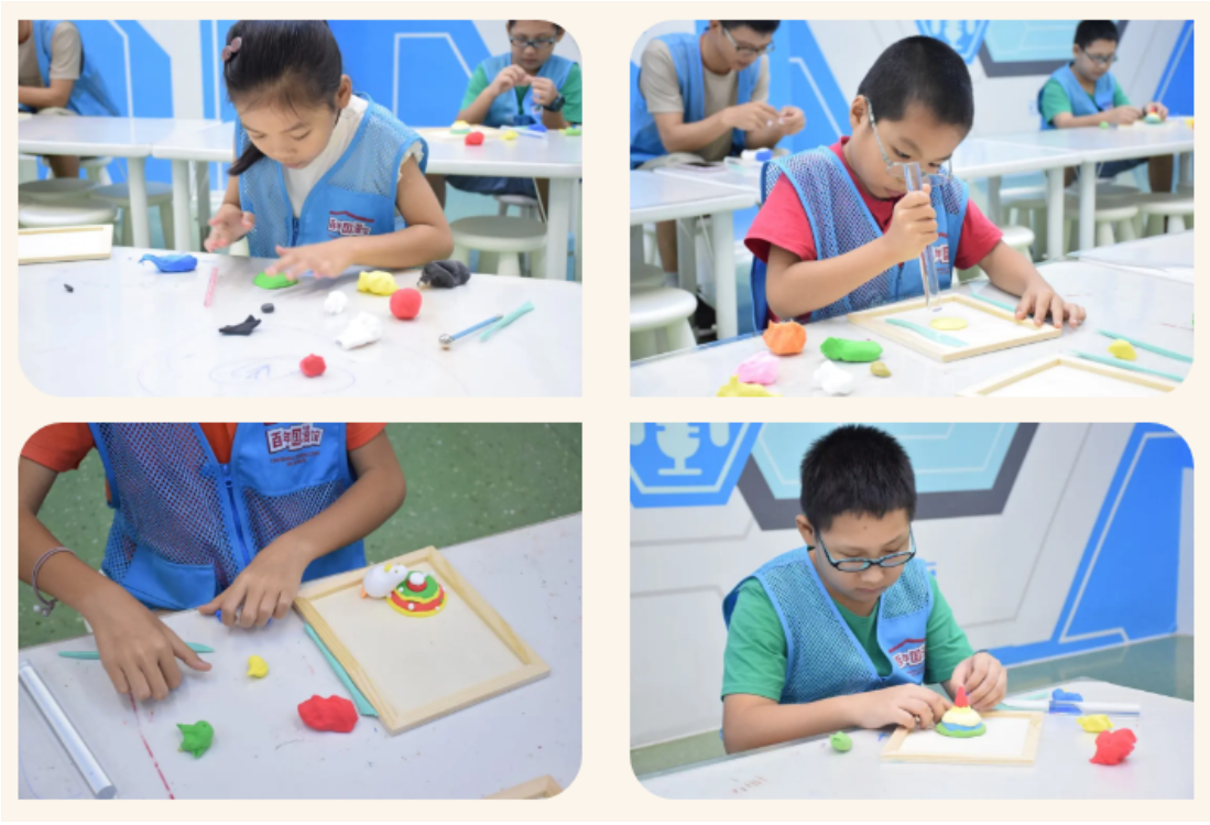 活动现场,在艺术讲师的引导下,孩子们学会如何选择合适的颜色、如何混合不同的泥土,以及如何把一块普通的黏土变成一件艺术品。孩子们通过对黏土的揉、捏、搓、贴等动作,发挥奇妙无穷的想象,让平平无奇的黏土变成一件件有创意的手工艺术品,亲手捏造一个动漫世界。