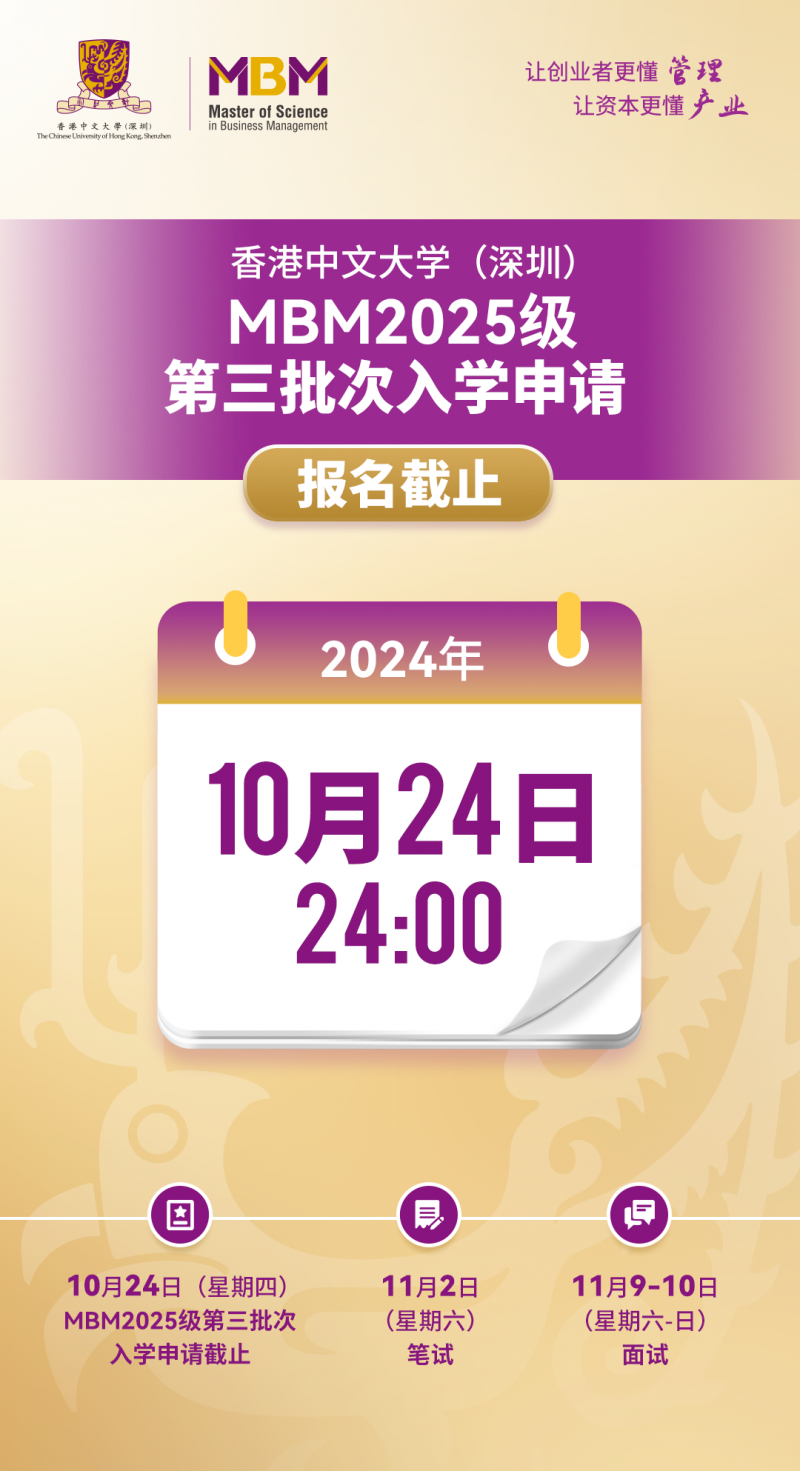 香港中文大学(深圳)管理学理学硕士项目MBM2025级第三批次入学申请将于10月24日(星期四)24:00截止,欢迎准备报读的同学尽早提交申请,早日获得考试机会!