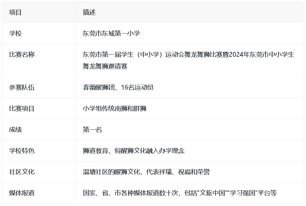 近日,在东莞市第一届学生(中小学)运动会舞龙舞狮比赛暨2024年东莞市中小学生舞龙舞狮邀请赛中,东城第一小学醒狮队表现出色,最终荣获小学组冠军。
