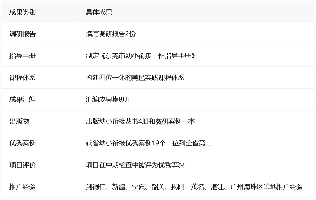 在过去的三年里,东莞以高度的责任感和使命感,克服重重困难,取得了显著成果,积累了宝贵经验:撰写调研报告2份,制定《东莞市幼小衔接工作指导手册》,构建四位一体的莞邑实践课程体系,汇编成果集8册,出版幼小衔接丛书4册和教研案例一本;项目在中期检查中被评为优秀等次;获省幼小衔接优秀案例19个,位列全省第二。
