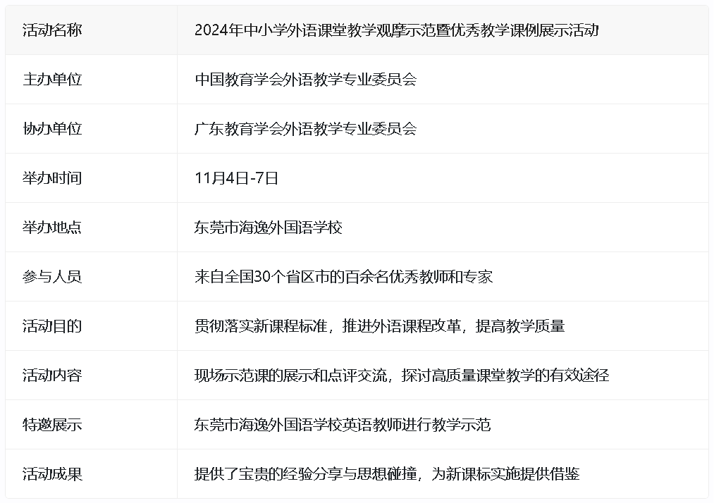 此次2024年中小学外语课堂教学观摩示范暨优秀教学课例展示活动的成功举办,不仅为全国各地的外语教师提供了一个交流学习的平台,更通过生动的教学示范和深入的研讨,推动了新课标理念在课堂教学中的落地生根。活动所展示的高质量课堂教学的有效途径和方法,对于提升我国基础外语教育的质量和水平具有重要的指导意义。同时,对东莞市海逸外国语学校的表彰,也充分肯定了该校在英语教研教学方面的突出贡献和成绩,为其他学校提供了可借鉴的经验和模式。