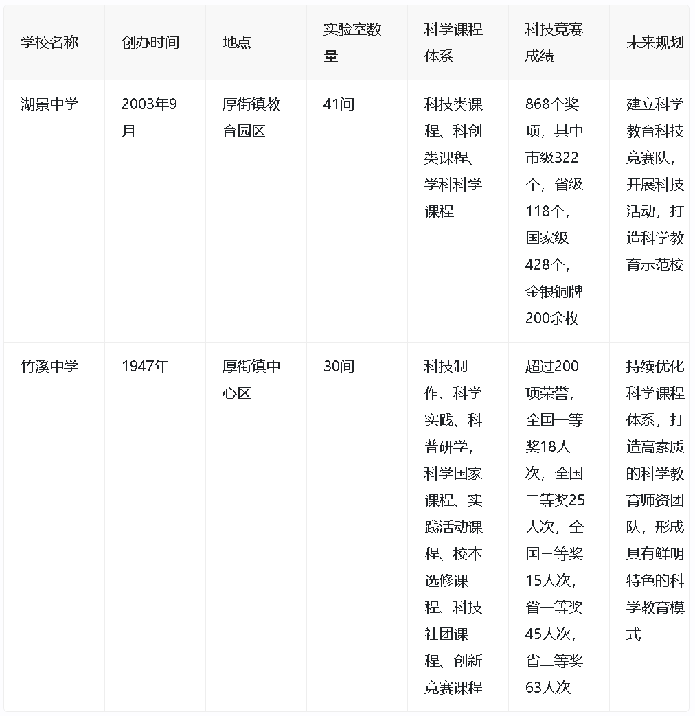 厚街镇湖景中学和竹溪中学的成功入选首批广东省中小学科学教育示范校,不仅是对两所学校在科学教育方面所做努力的认可,更是对其未来发展的鼓舞和期待。通过高标准的实验室配置和多元化的科学课程体系,两所学校为学生提供了丰富的科学实践机会,有效提升了学生的科学素养和创新能力。未来,随着科学教育科技竞赛队的建立和科学课程体系的持续优化,相信这两所学校将继续在科学教育领域发挥示范和引领作用,为区域科学教育水平的提升做出更大的贡献。