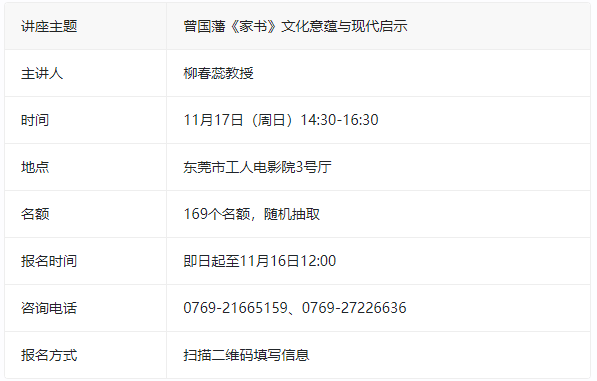 为了提升职工素质,深入了解中国历史文化,东莞市工人电影院将于11月17日举办一场关于曾国藩《家书》的讲座。本次讲座特邀北京大学文学硕士博士、南开大学博士后、万柳书院院长、南昌大学特聘教授、北京大学副教授柳春蕊教授主讲,他将在讲座中解读《家书》中的文化意蕴和当代价值。
