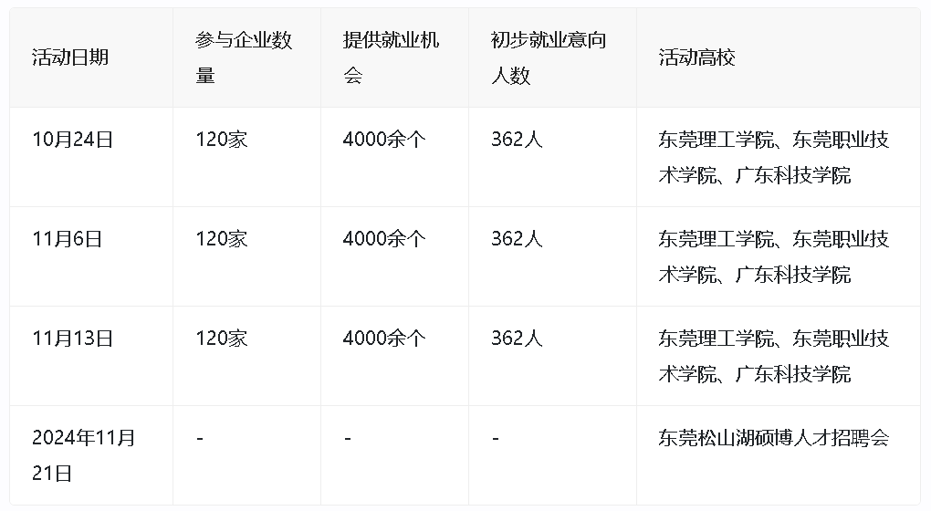 金秋时节,东莞松山湖迎来揽才好时机。松山湖党建工作办公室精心策划,于10月24日、11月6日和11月13日,组织120家优质企业深入东莞理工学院、东莞职业技术学院、广东科技学院等高校,开展引才活动,为毕业生提供“毕业即就业”的机会,鼓励他们留莞、留“湖”发展。