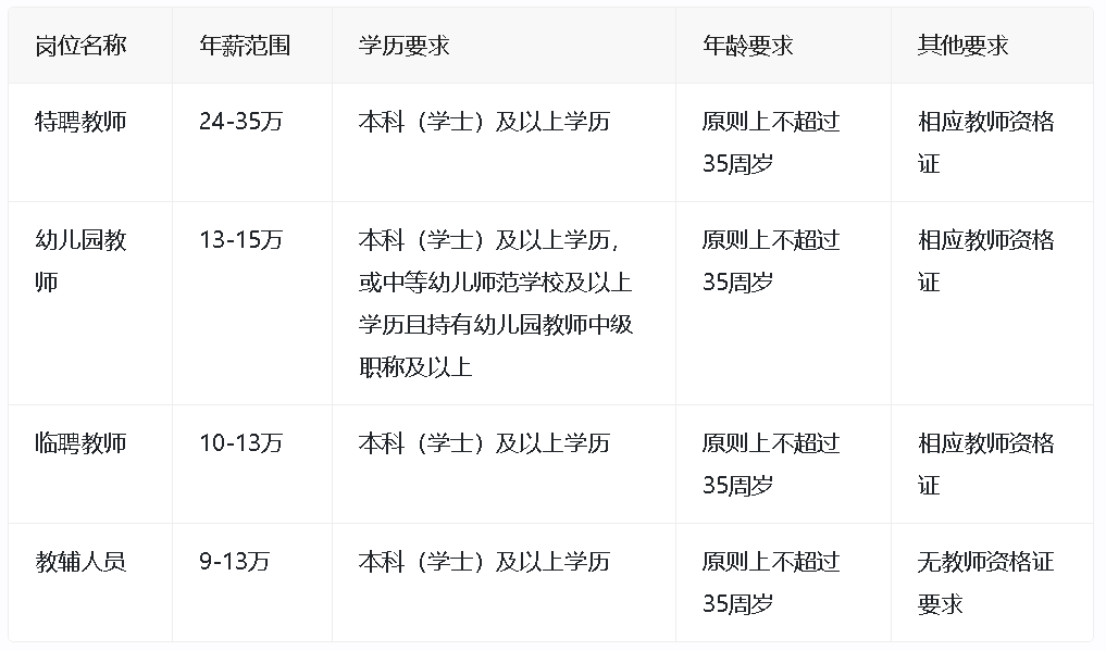 - 幼儿园教师:普通高校本科(学士)及以上学历,或第一学历为中等幼儿师范学校及以上且持有幼儿园教师中级职称及以上,特别优秀者可适当放宽职称要求
