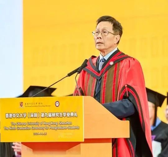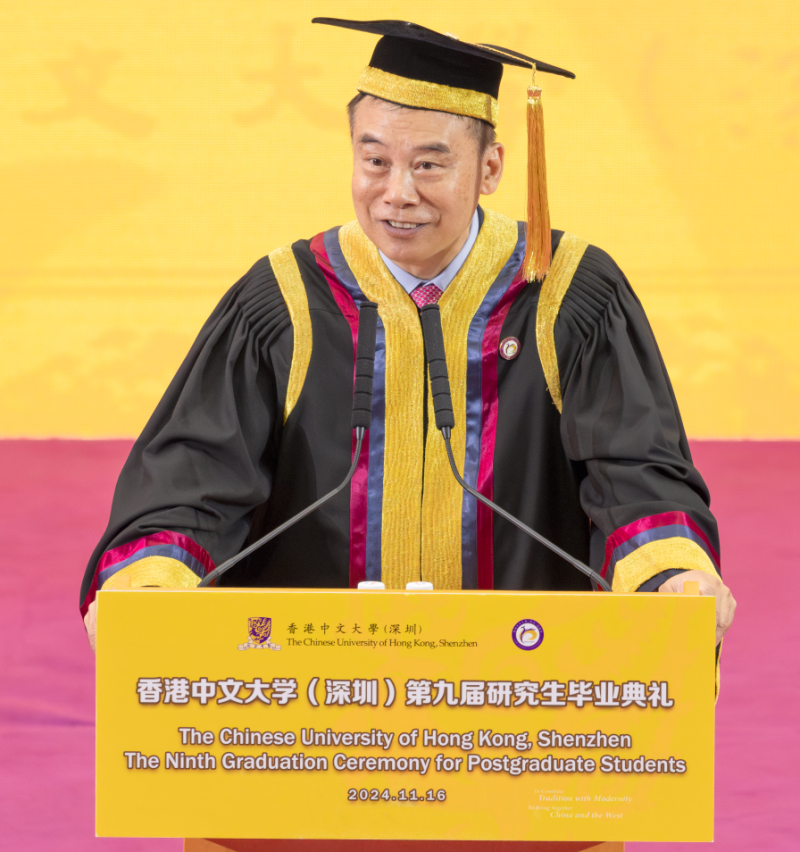 随后,香港中文大学(深圳)艾春荣教授在致辞中赞赏了本届毕业生在求学期间做出的努力与实践,并衷心希望毕业生们要不畏艰难,勇往直前,用实际行动诠释“学无止境”的真谛;要不断探索,不断学习,让终身学习成为人生的座右铭;要心系社会,回馈国家,用实际行动践行港中大(深圳)的校训精神。