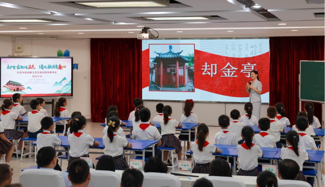 五百年前东莞县丞李恺拒收番商金箔的故事,在莞城英文实验学校的3D全息沙盘上重现。当学生用手指划开虚拟金锭,碑文"却金遗风"四个大字在却金亭模型上浮现——这场六月十七日的廉洁文化推进会,正用数字技术让廉政教育穿透时空。