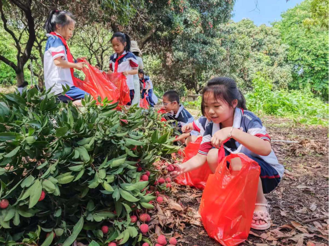 晨光穿透荔枝树冠,在桥头一小共生园泥地上投下斑驳光点。六年级学生陈浩紧握三米高的摘果器,金属夹颤巍巍探向树顶红果,"咔哒"轻响后鲜荔应声坠落,树下立即爆发出欢呼。6月18日这场全校参与的采荔活动,让劳动教育浸满果香:体育老师手持枝剪示范时,三十余棵老树低垂的枝条已缠上防滑布——这是为低年级特设的"安全采摘区",锯平的枝干平铺如绿色长桌,供百名孩童跪坐挑选。
