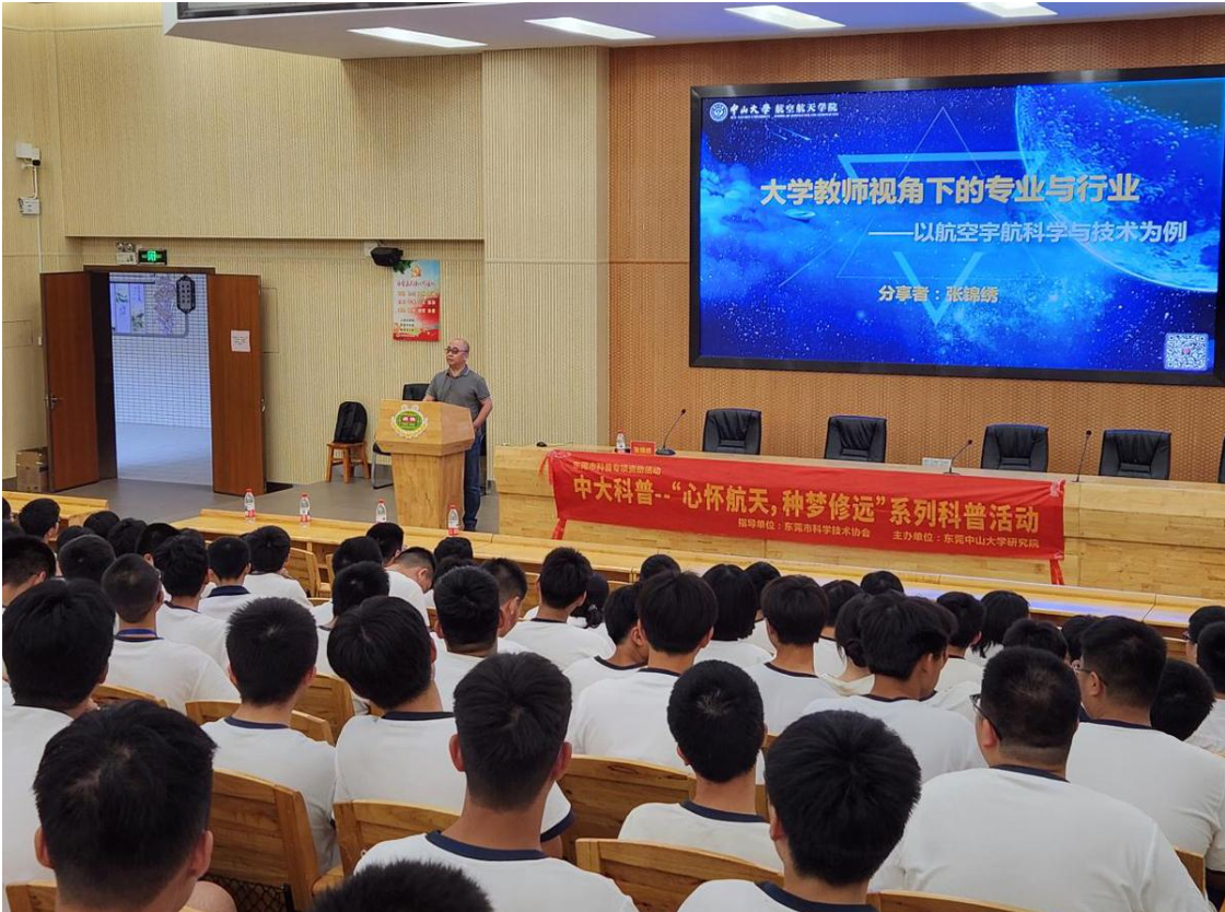 东华高级中学报告厅的穹顶暗了下来,张锦绣教授指尖轻触控制屏,一颗微型卫星模型在全息投影中旋转分解。“这颗由学生设计的‘天琴二号’,将在明年搭载长征火箭升空。”5月29日下午,中山大学航空航天学院副院长的开场白引发两百名学子低呼。当投影切换至跨介质飞行器穿越海空的画面,前排学生不自觉地前倾身体——这是“中大科普·心怀航天种梦修远”系列活动的第八站,空天科技的种子正落进东莞校园。