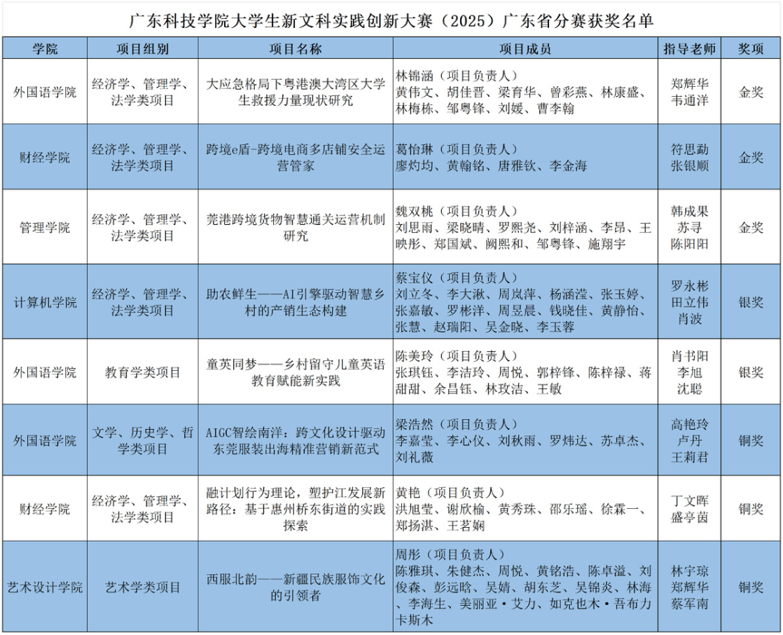 2025年10月12日,由全国新文科教育研究中心主办、广东省教育厅指导、华南农业大学承办的广东省大学生新文科实践创新大赛现场决赛顺利举行。广东科技学院在本届大赛中表现出色,共斩获金奖3项、银奖2项、铜奖3项,并首次荣膺“优秀组织奖”,实现了赛事成绩的重大突破。