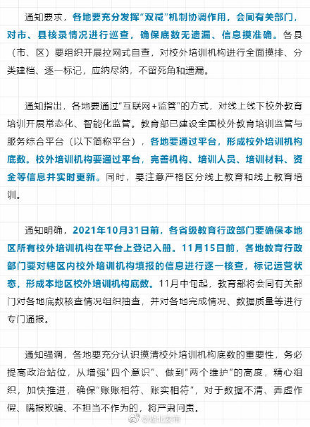 为进一步贯彻落实“双减”工作要求,全面提升校外教育培训综合治理的精准化、科学化、信息化水平,日前,教育部印发通知,部署建立校外培训机构底数核查机制。