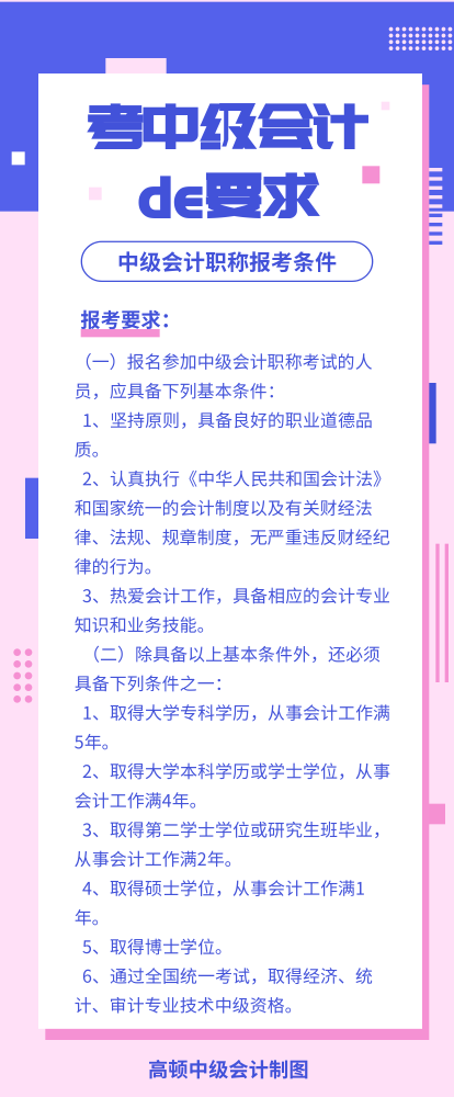 报名条件中要求考生满足具体的学历和工作年限要求,在财政部发布的《全国会计专业技术中、高级资格考试有关问题答记者问》中对工作年限认定进行了具体阐述,详情如下: