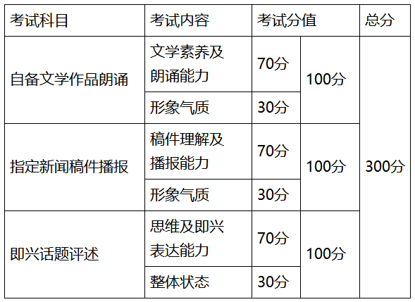 播主校际联考满分为300分,自备文学作品朗诵、指定新闻稿件播报和即兴话题评述三门科目各100分。