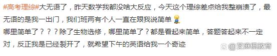 有考生表示:“昨天数学我都没啥大反应,今天这个理综差点给我整崩溃了,最无语的是我一出门,我们班两有个人一直在跟我说简单”。也有考生调侃:“不想让我读大学就直说,请不要拿来一套试卷侮辱我”。更是有考生直言:“生物整体不难,化学除了选修都不难,物理…别提了物理以前是我最擅长的一科,考完了变成最差的一科了”。