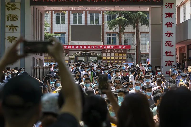 2022年6月7日,河南省洛阳市高考第一天上午语文考试结束后学生满怀信心地走出考场,家长们在校门外迎接孩子。